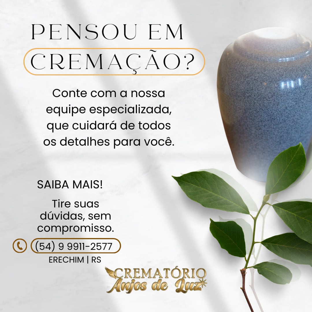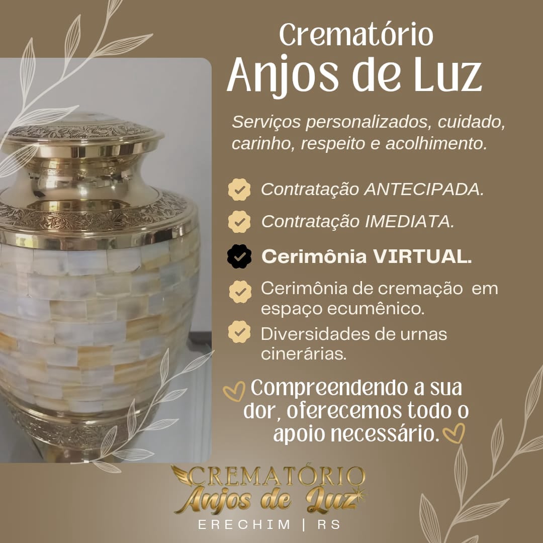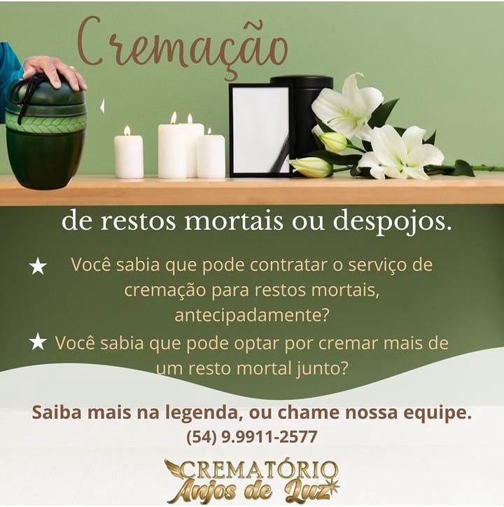 Crematório Anjos de Luz está localizado numa ampla área de fácil acesso junto ao cemitério ecumênico Jardim Eterno. Surgiu de um desejo do proprietário LUIZ WALTER ANDREETTA em ampliar o espaço já existente, inovar e atender as necessidades e pedidos da população e de muitos clientes do cemitério parque que está sob sua administração.